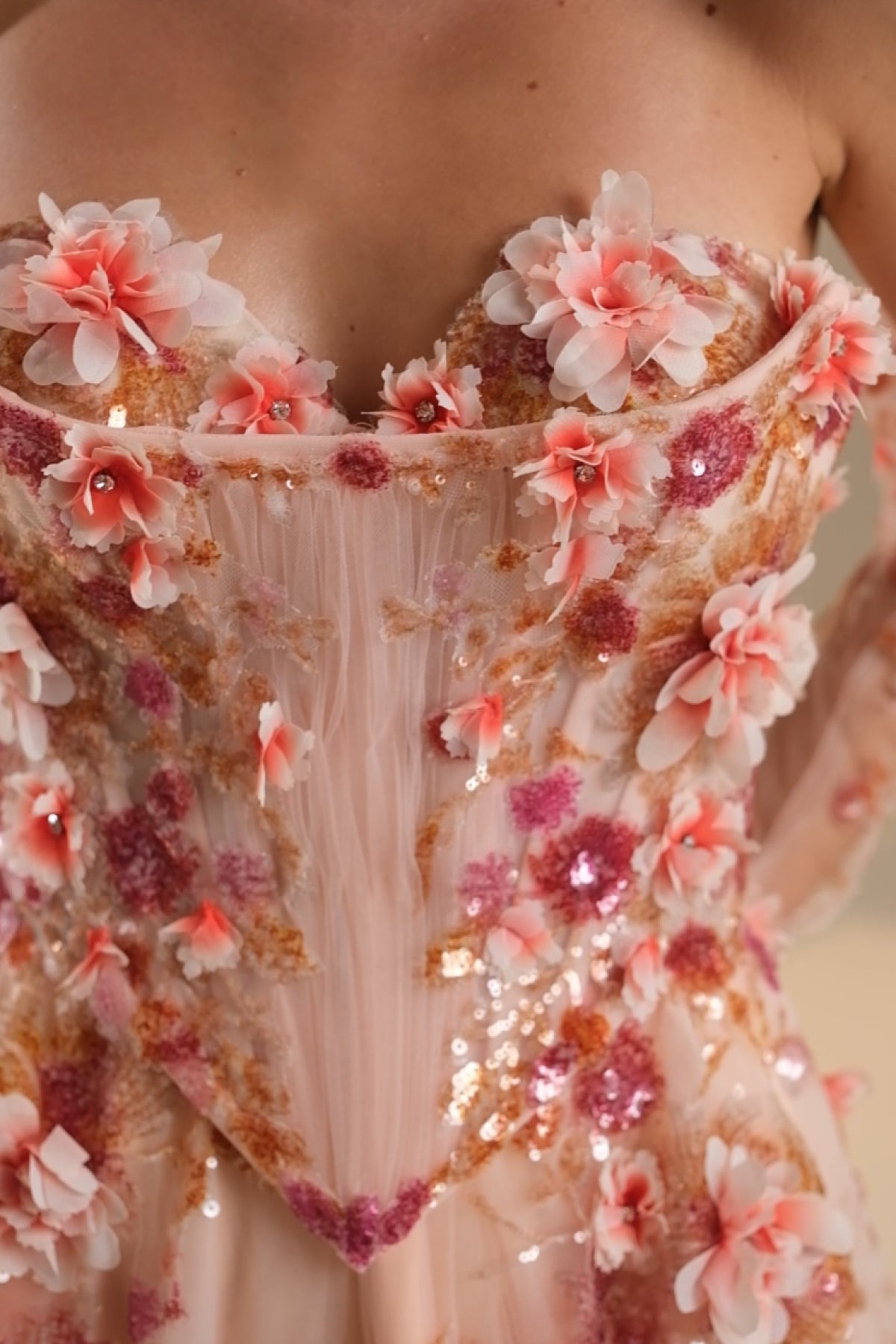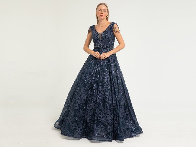 Çiçek Desenli Payet İşlemeli Prenses Elbise