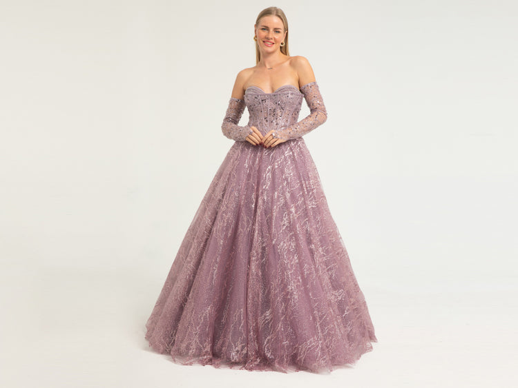ÜST KISMI İŞLEMELİ DÜŞÜK KOL DETAYLI TÜL ABİYE