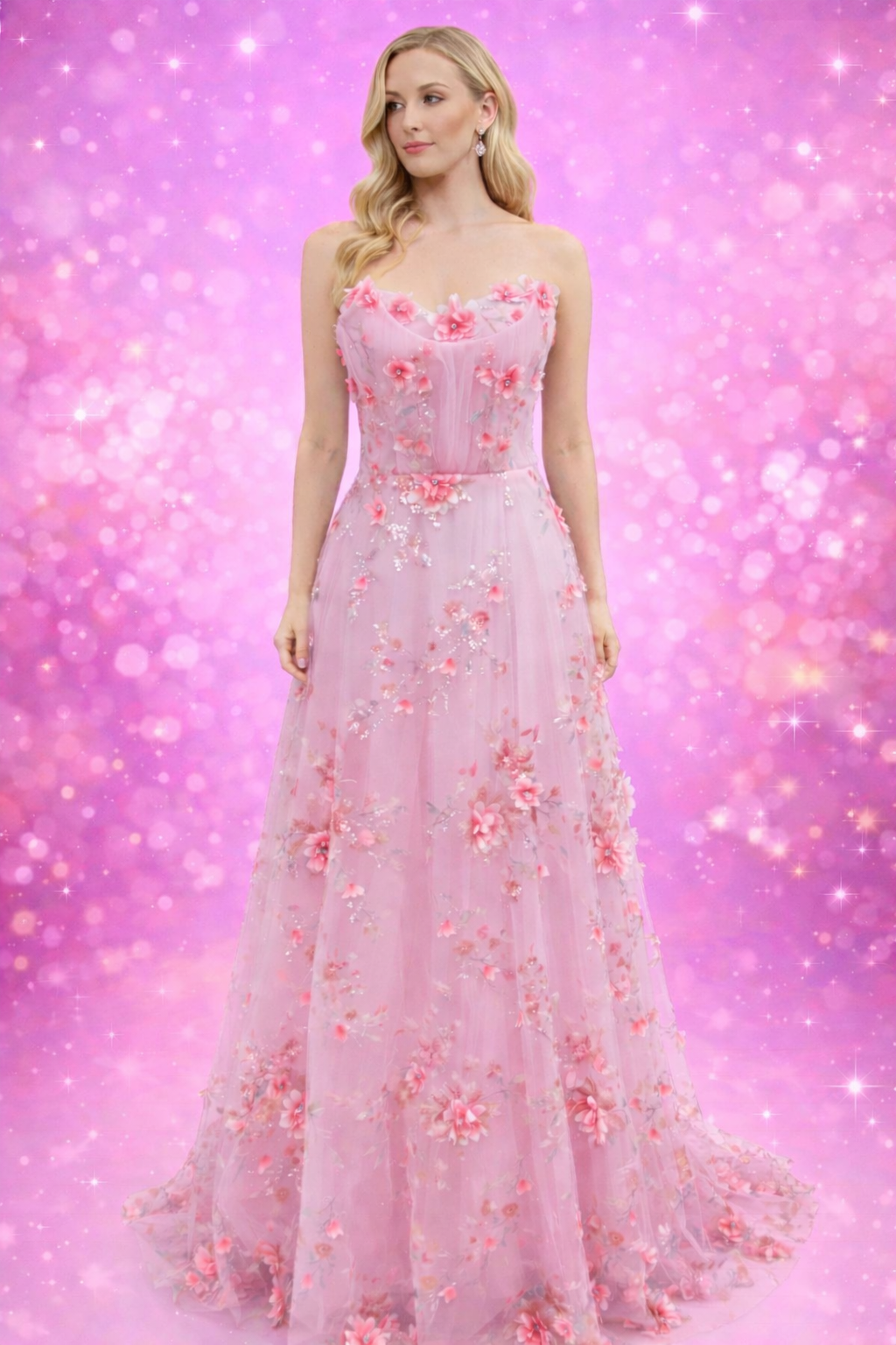 3 Boyutlu Çiçek Desenli Straplez Abiye