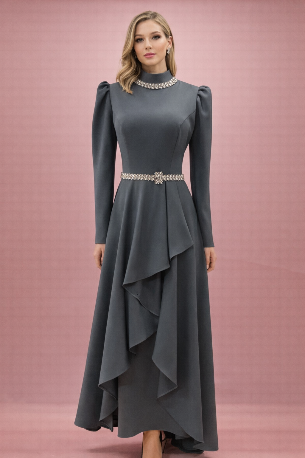 Antrasit Taş Yakalı Katmanlı Tesettür Abiye