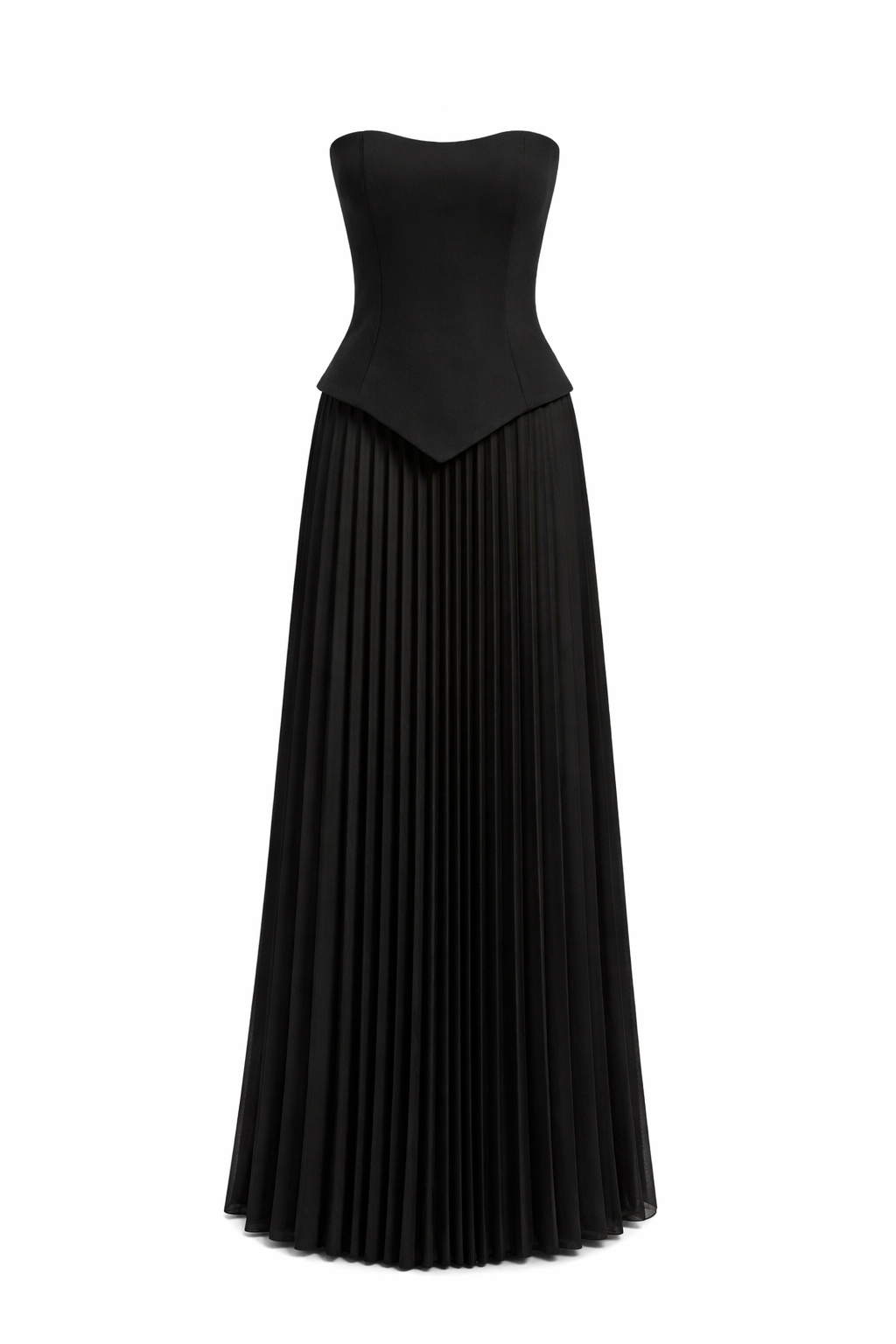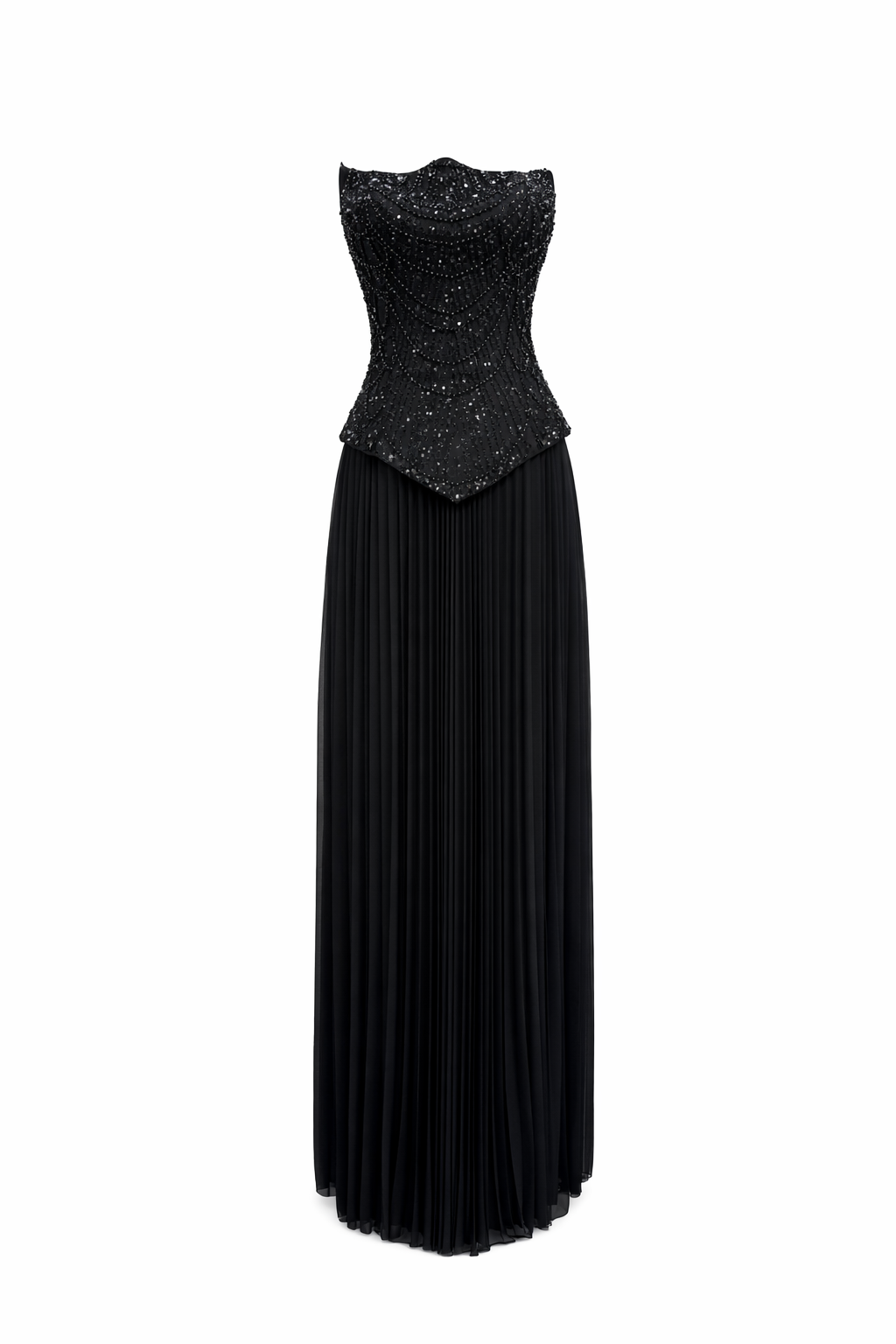 "Işıltılı büstiyer üst ve pliseli uzun şık tasarım."