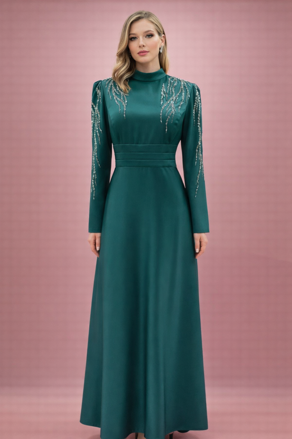 Yüksek yakası ve uzun kollu tasarımıyla dikkat çeken bu abiye elbise, zarafetin en sofistike halini...