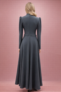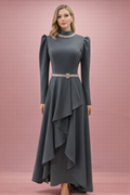 Antrasit tonunun zamansız şıklığını, taş detaylı yaka ve kemer vurgusuyla buluşturan zarif bir tasarım. Omuzlardaki hafif balon form güçlü bir siluet sunarken, etek bölümündeki katmanlı yapı harekete sofistike bir akış kazandırır. Bel kısmında yer alan taşlı kemer detayı formu dengeli şekilde öne çıkarır. Düğün, davet ve özel organizasyonlarda sade ama etkileyici bir görünüm arayanlar için ideal bir tercihtir.
