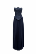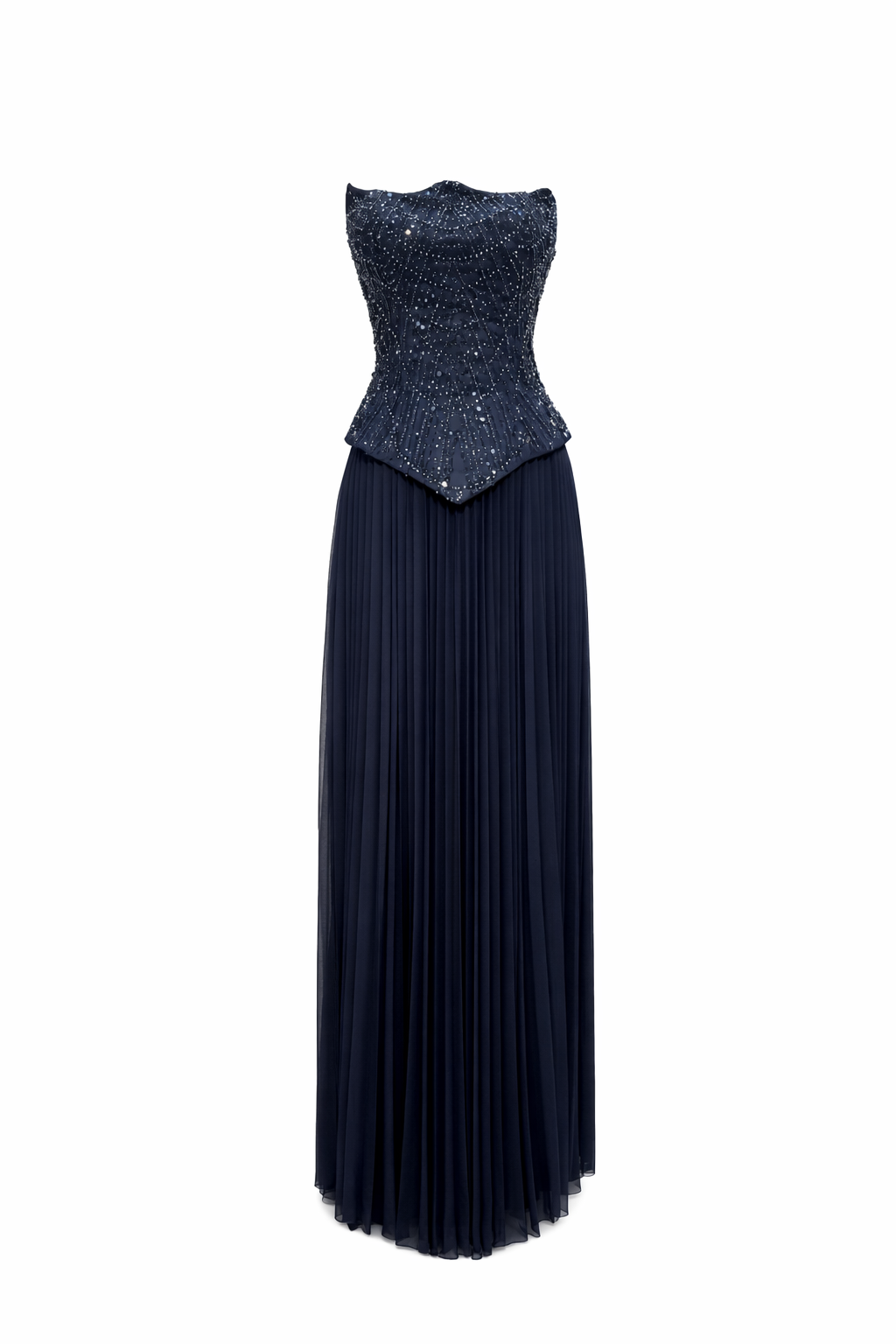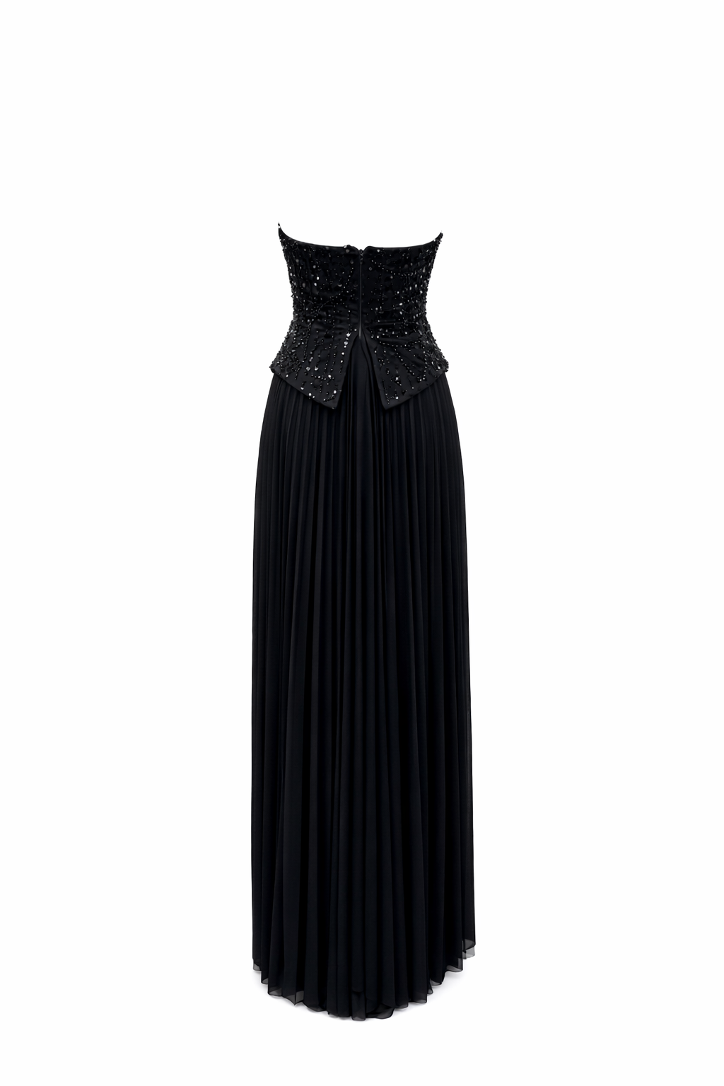 "Işıltılı büstiyer üst ve pliseli uzun şık tasarım."