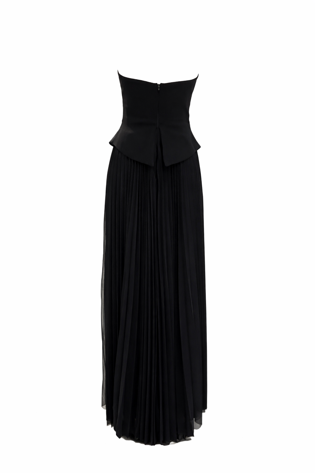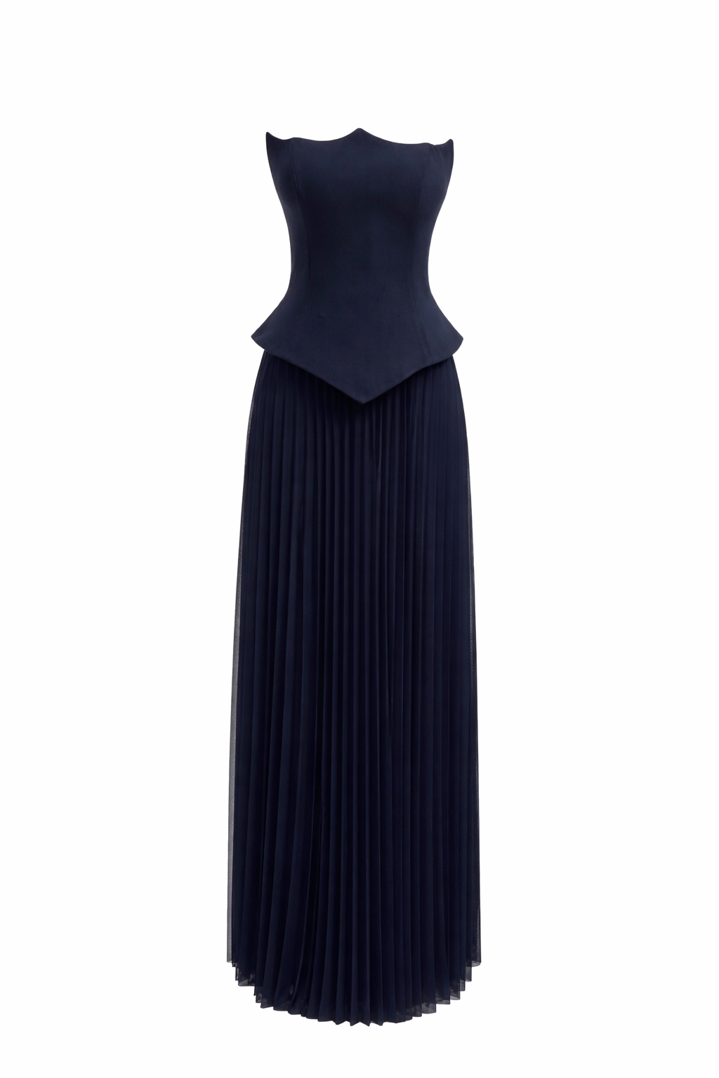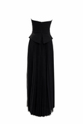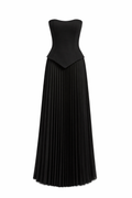Keskin hatlı üst formu ve zarif plise detaylı alt bölümüyle modern ve güçlü bir siluet sunan bu parça, şık davetlerde sofistike bir görünüm arayanlar için ideal bir tercih.