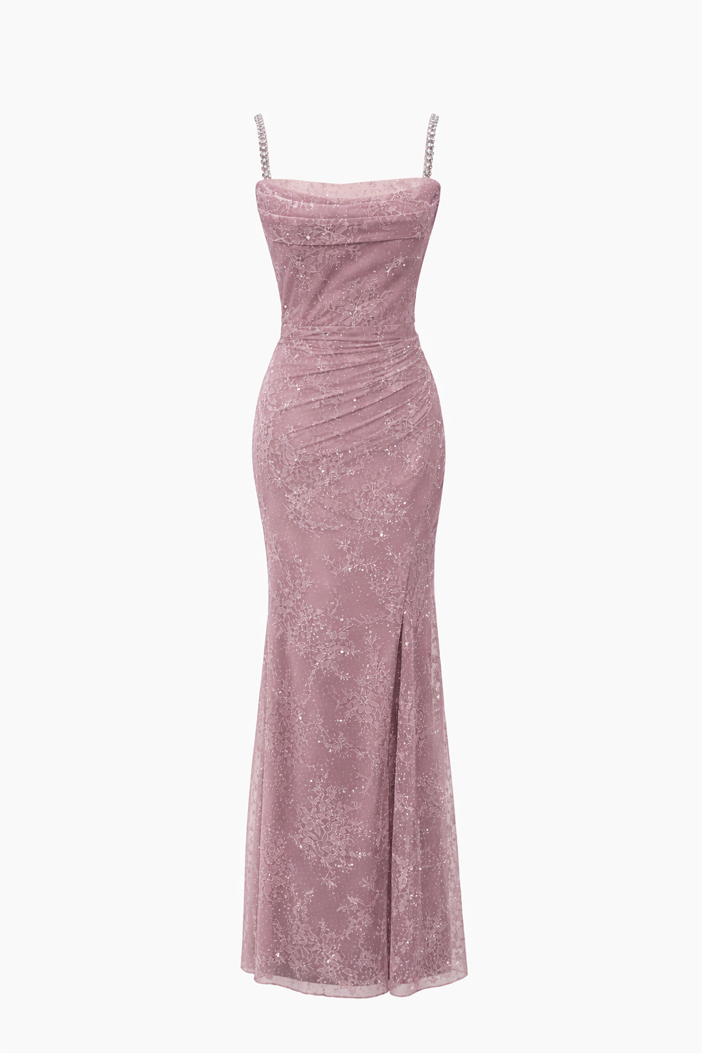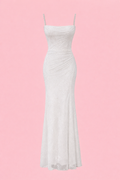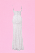 Pudra, beyaz tonlarında,ince askılı,ışıltılı işlemeleri ve zarif yırtmaç detayıyla öne cıkan uzun gece abiyesi