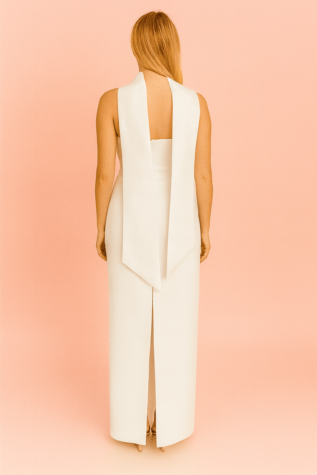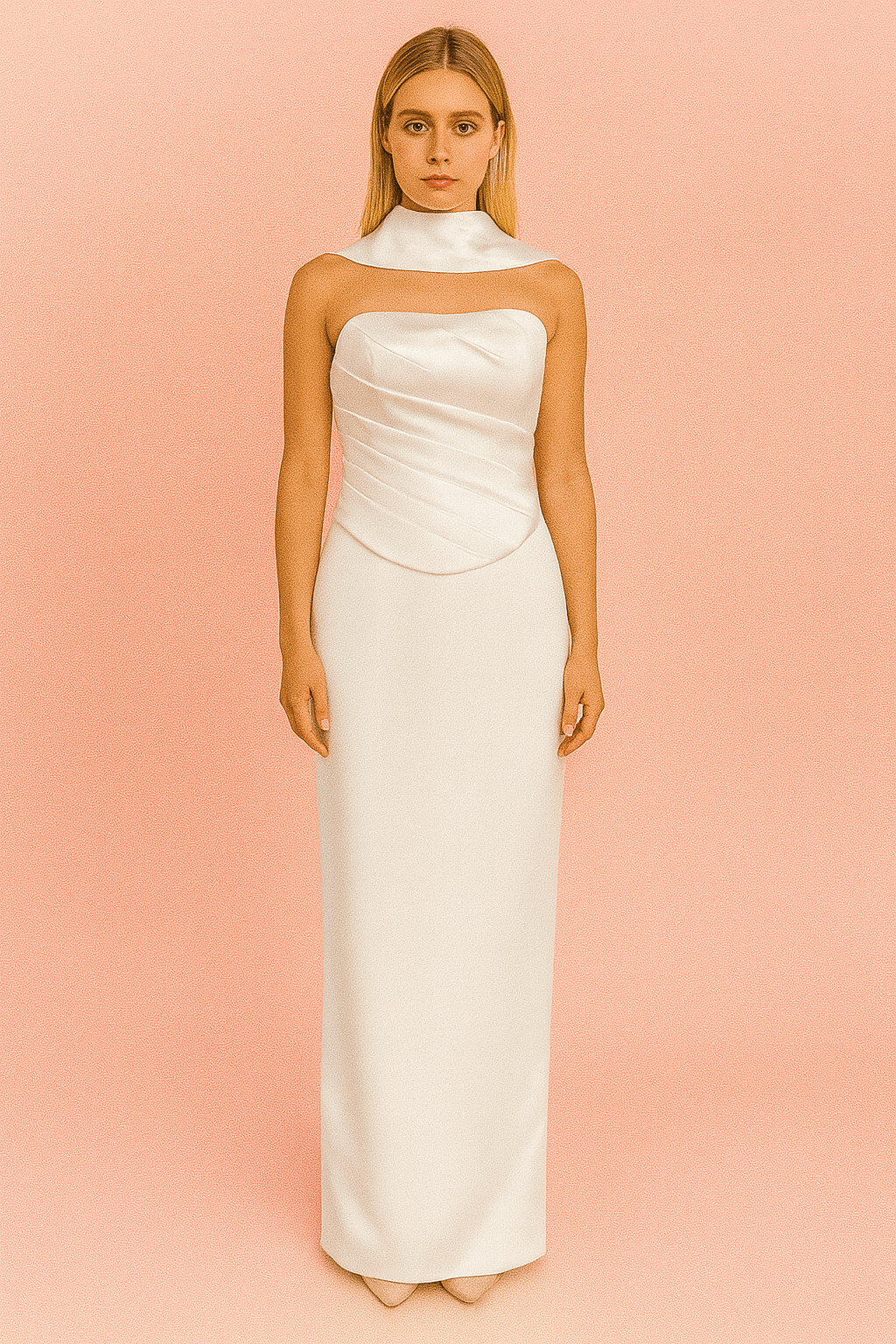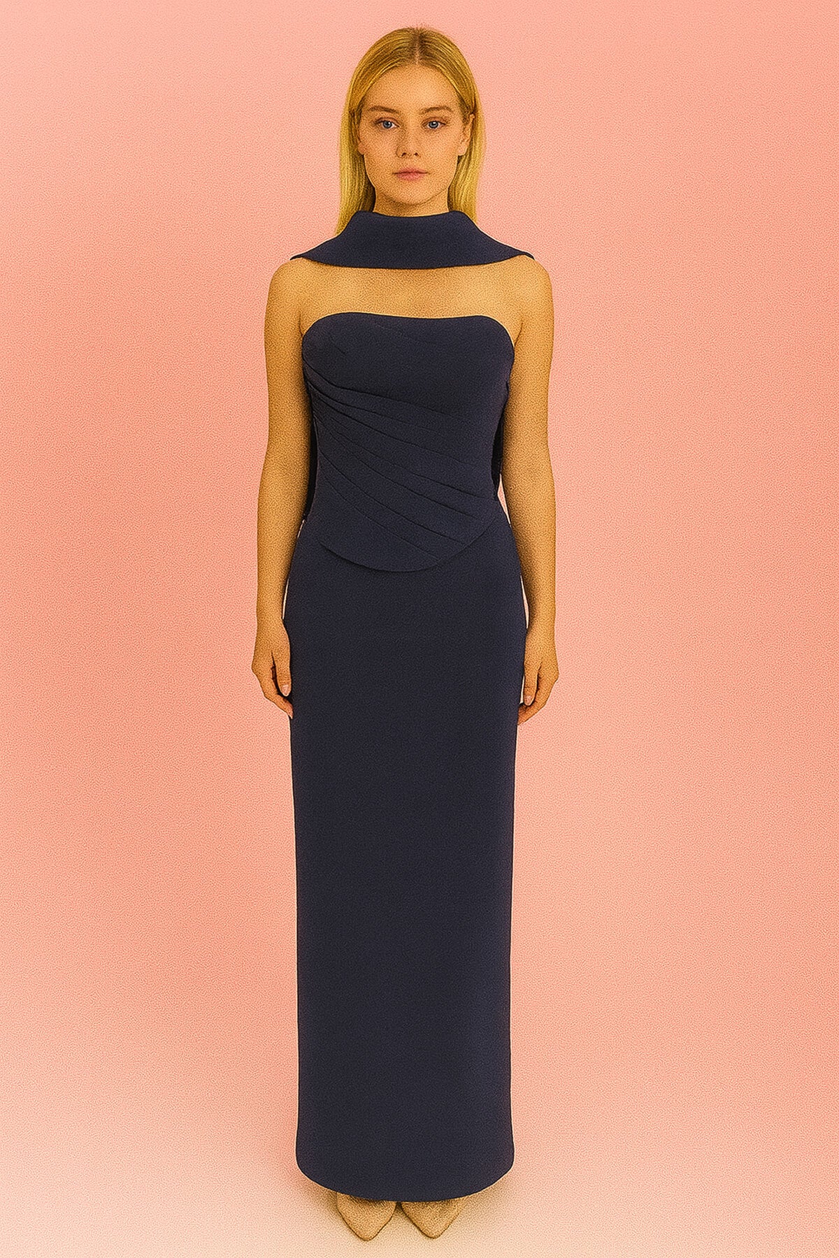 Göğüs bölümünde drapeli modern form çalışması bulunan, uzun ve sade siluetiyle şık bir duruş sunan bu tasarım; omuz üstünden geçen geniş şerit yakasıyla dikkat çeken zarif ve güçlü bir görünüm oluşturur.