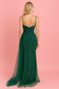 Tamamı ince işleme detaylarıyla süslenmiş zümrüt tonlu şık bir model. Derin V yaka formu, vücuda oturan silueti ve yırtmaçlı yapısı zarafeti öne çıkarırken, yan taraftaki tül kuyruk modern ve gösterişli bir dokunuş sunar.
