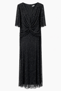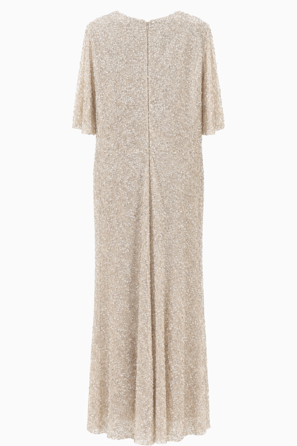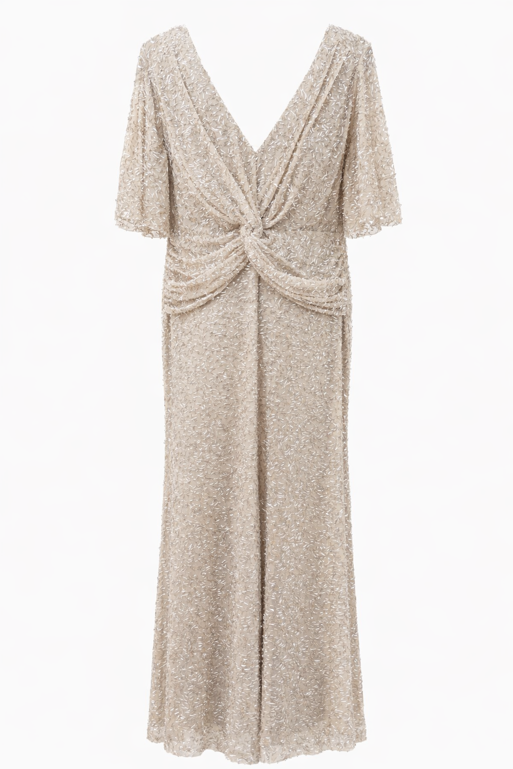 Krem tonunun sofistike ışıltısını dokulu payet yüzeyiyle buluşturan bu tasarım, V yakası ve önden düğümlü bel detayıyla feminen bir silüet oluşturur. Yarım kolları ve akıcı formu sayesinde hem şık hem de konforlu kullanım sunar. Sadelik ve ışıltıyı dengeli bir şekilde bir araya getiren model, nişan, düğün ve özel davetlerde zarif bir tarz arayanlar için ideal bir seçimdir.