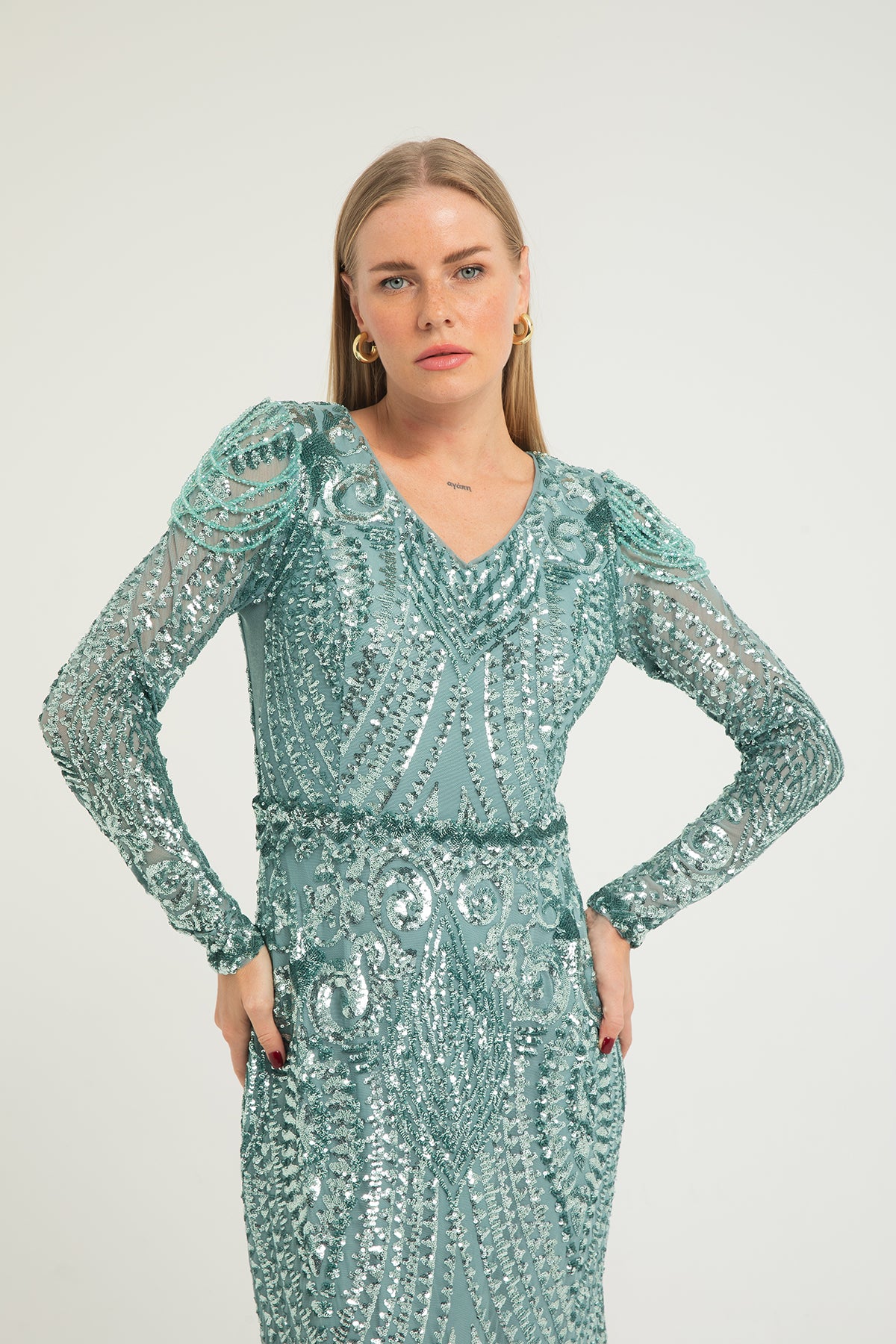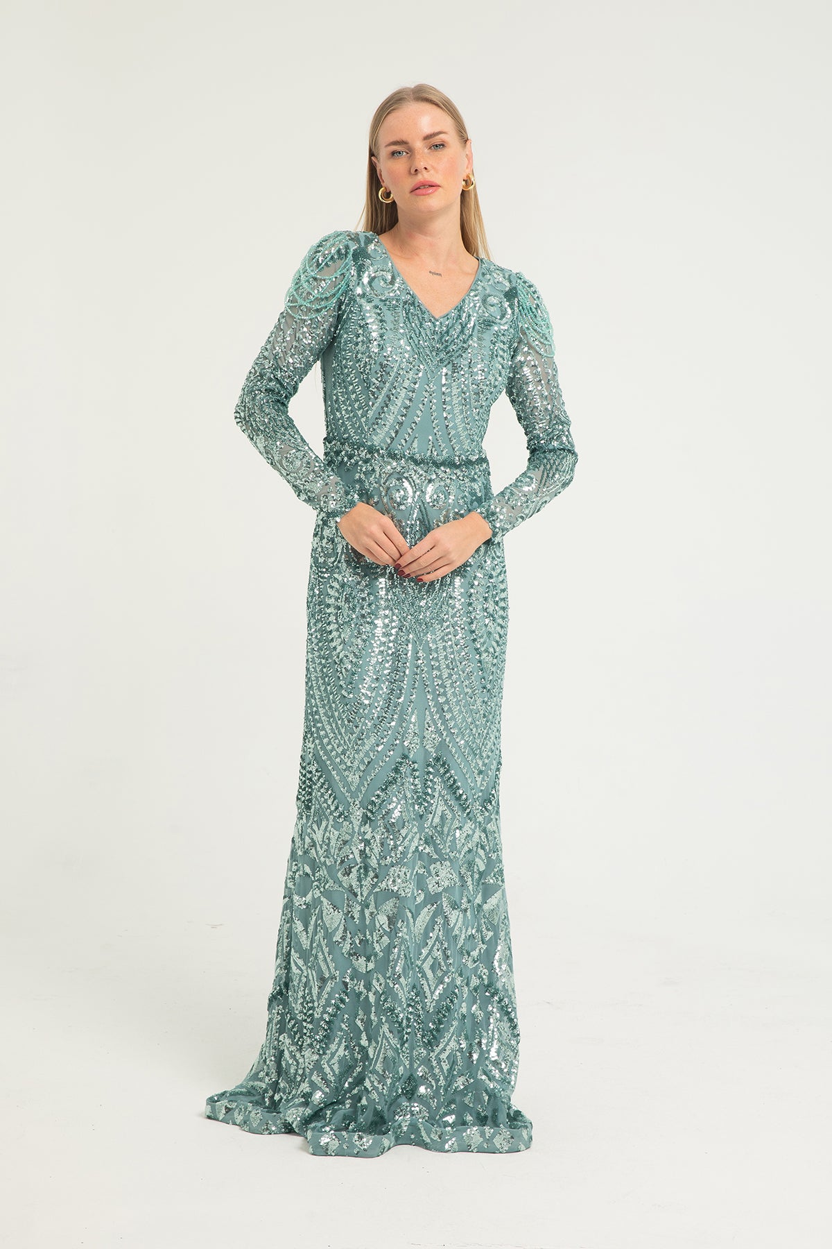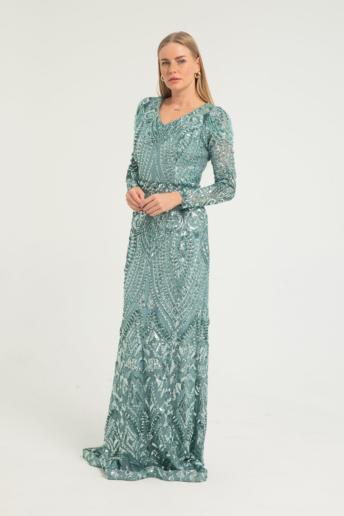 Işıltısı ve zarafetiyle öne çıkan uzun kollu işlemeli balık kesim abiye, stil sahibi kadınların tercihi. V yakası ve omuz detayları, feminen bir duruş sunarken, tamamı parlak işlemelerle kaplı tasarımı şıklıkla buluşturuyor. Özel davetlerde ve kış düğünlerinde göz alıcı bir seçim.