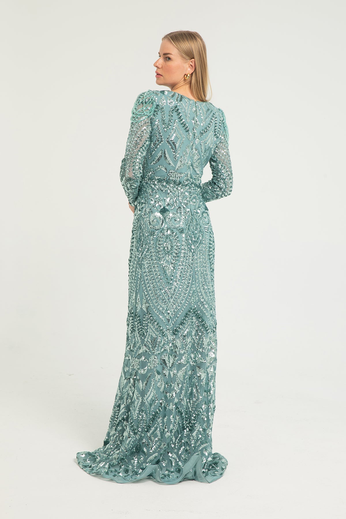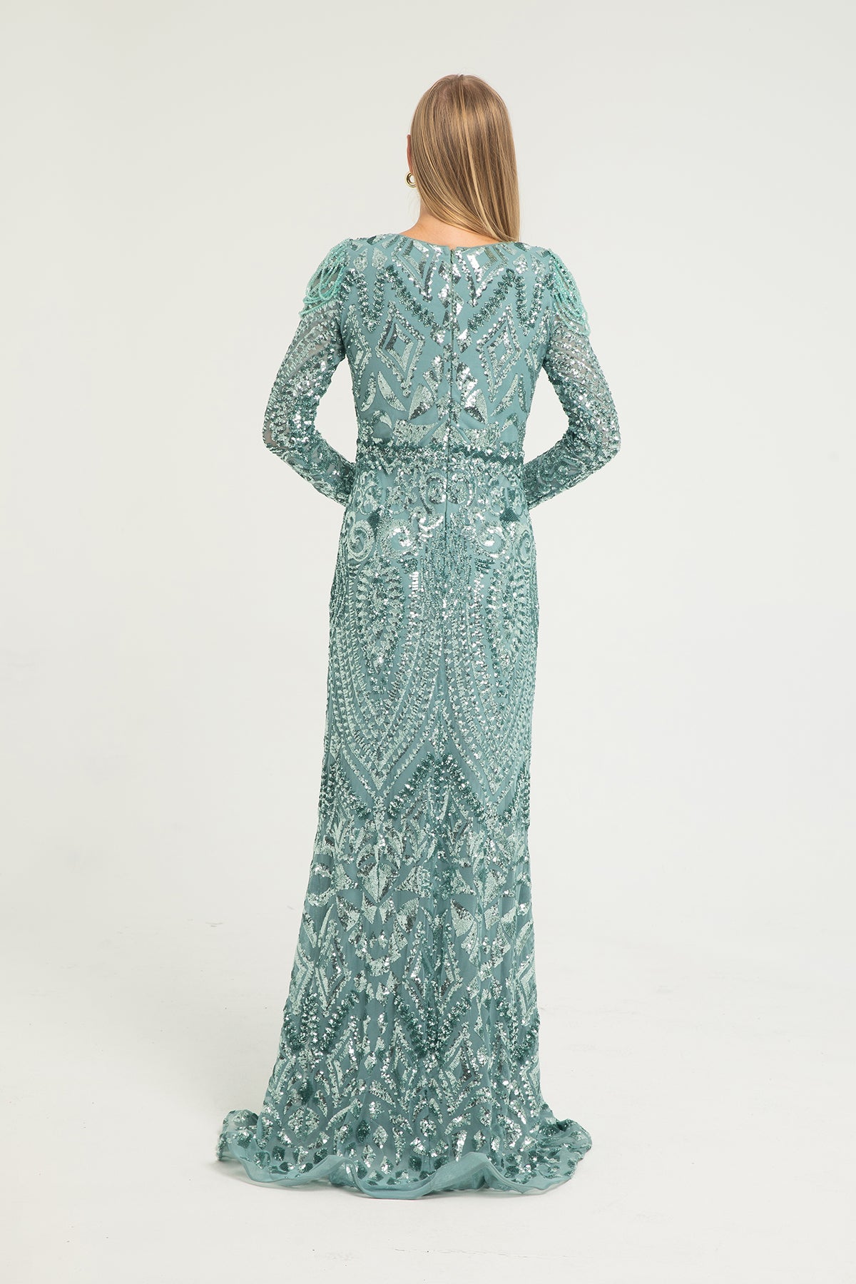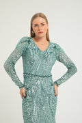 Uzun Kollu İşlemeli Balık Kesim Abiye